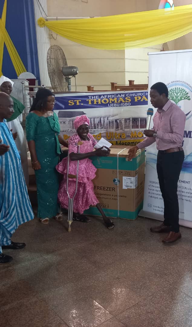 Following our passion at Trebrikev Braimoh Foundation Mrs Dorcas Adenuga was discovered in Ijebu-Igbo (Nigeria).With the passion to make things happen for herself and family she had plans to set little business up out of the embroidering work (because this is affecting her health) but was financially hindered. She applied for financial assistance from the foundation and she was provided with a fridge and a start up capital to execute her project.
